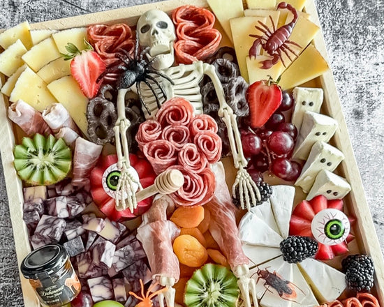 A spooktacular skeleton-themed cheese and charcuterie board, featuring eerie cheeses and ghoulishly delicious meats for a hauntingly fun, frightfully tasty spread.