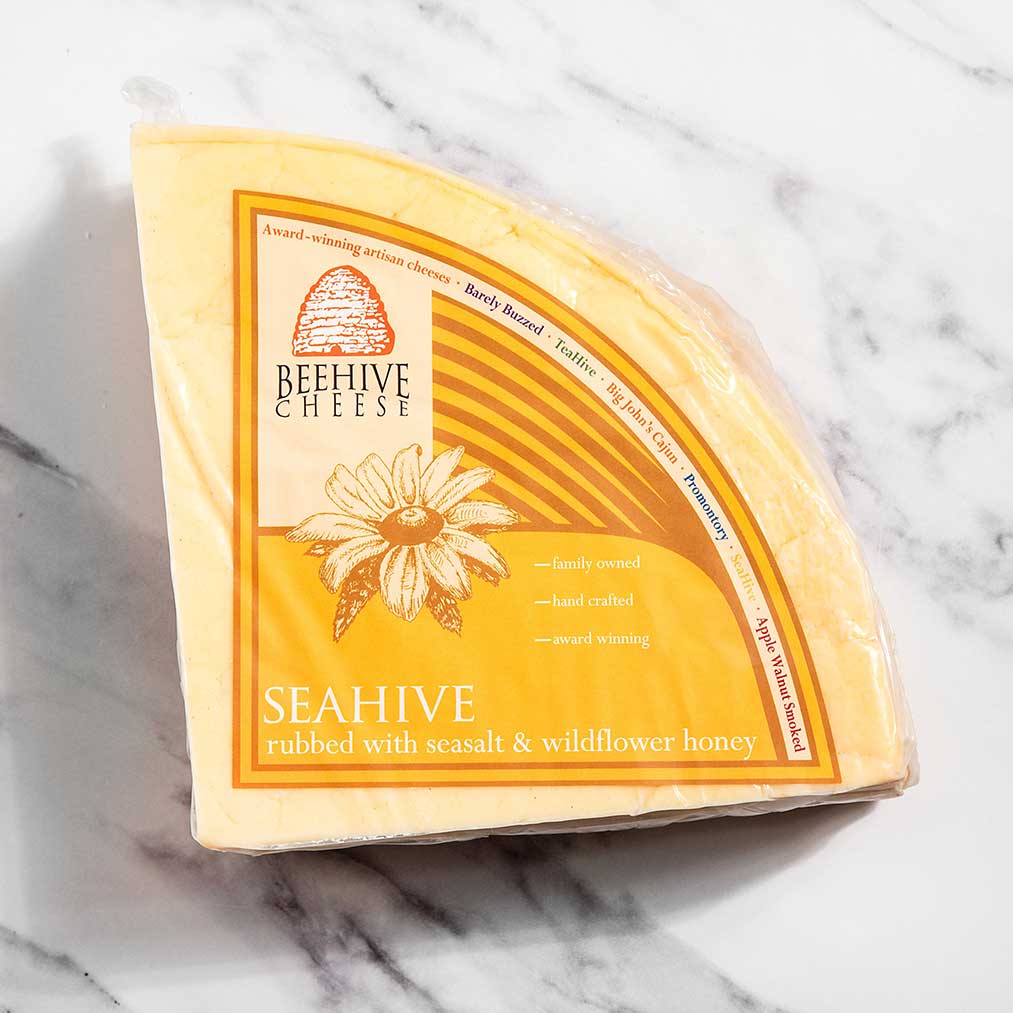 Seahive by Beehive Cheese is a Utah-made cheddar rubbed with sea salt and local wildflower honey. Its sweet and savory balance creates a uniquely smooth and creamy bite, making it a standout on any cheese board.