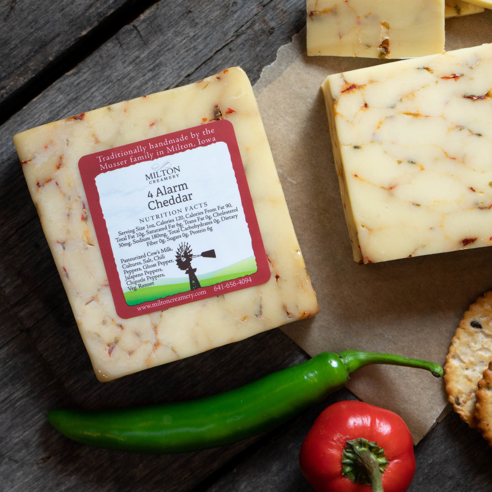 4 Alarm is a fiery blend of spicy pepper cheeses including jalapeño, chipotle, and habanero. This cow’s milk cheese packs intense heat while maintaining a creamy, meltable texture—perfect for nachos or bold cheese boards.